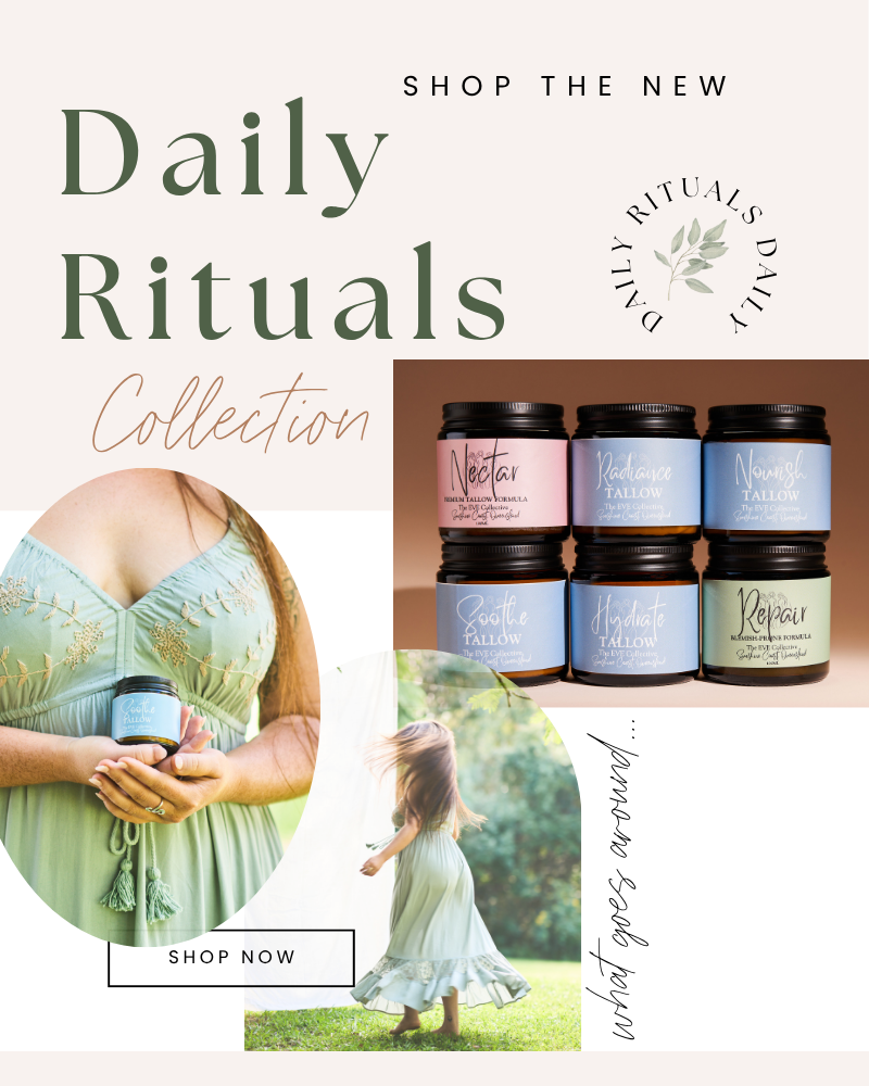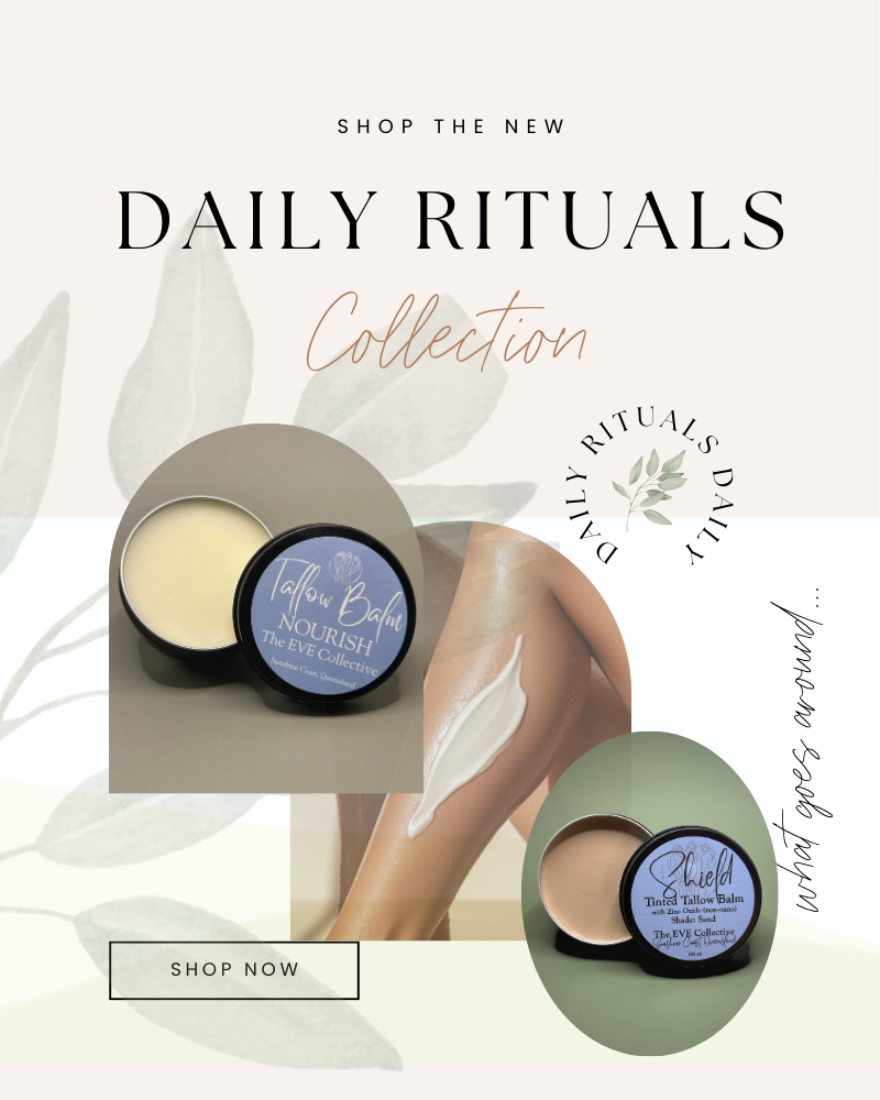 At The EVE Collective, we offer small-batch, tallow-based skincare made with organic ingredients and Australian botanicals. Our full collection includes deeply nourishing whips and balms, soothing healing salves, natural lash and brow care, refreshing botanical spritz, and more. Every product is crafted with intention to support healthy skin, hormonal balance, and natural beauty. Rooted in tradition and backed by purity, our formulations are gentle, effective, and designed to restore your daily rhythm.